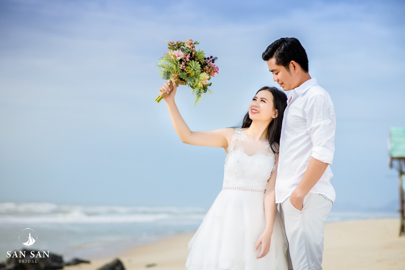 Nếu lựa chọn chụp ở biển thì những chiếc váy cưới có phần thiết kế đuôi dài thườn thượt, đứng bên bờ biển trắng xóa thì trông có vẻ rất nghệ thuật. Nhưng sẽ rất bất tiện trong việc di chuyển, chưa kể đến việc chiếc váy sẽ bị nước biển làm cho ướt sẽ trở nên rất nặng nề. Vì vậy trang phục đồ đôi hay cô dâu mặc váy ngắn, chú rể mặc short với áo thun hoặc sơ mi trẻ trung, năng động. Việc sử dụng những trang phục này giúp cho các bạn thoải mái trong việc di chuyển, hay tạo dáng với sóng biển.